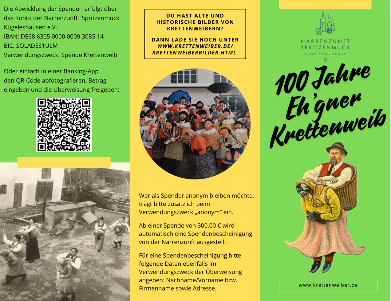 Zum 100-jährigen Jubiläum sammeln wir Bilder von Krettenweibern. Jeder ist aufgerufen, Bilder von Krettenweiber hier hochzuladen. Es werden auf den Umzügen von den Zuschauern viele Bilder von uns gemacht, die möchten wir gerne sammeln. Der Link zum Hochladen ist hier zu finden.