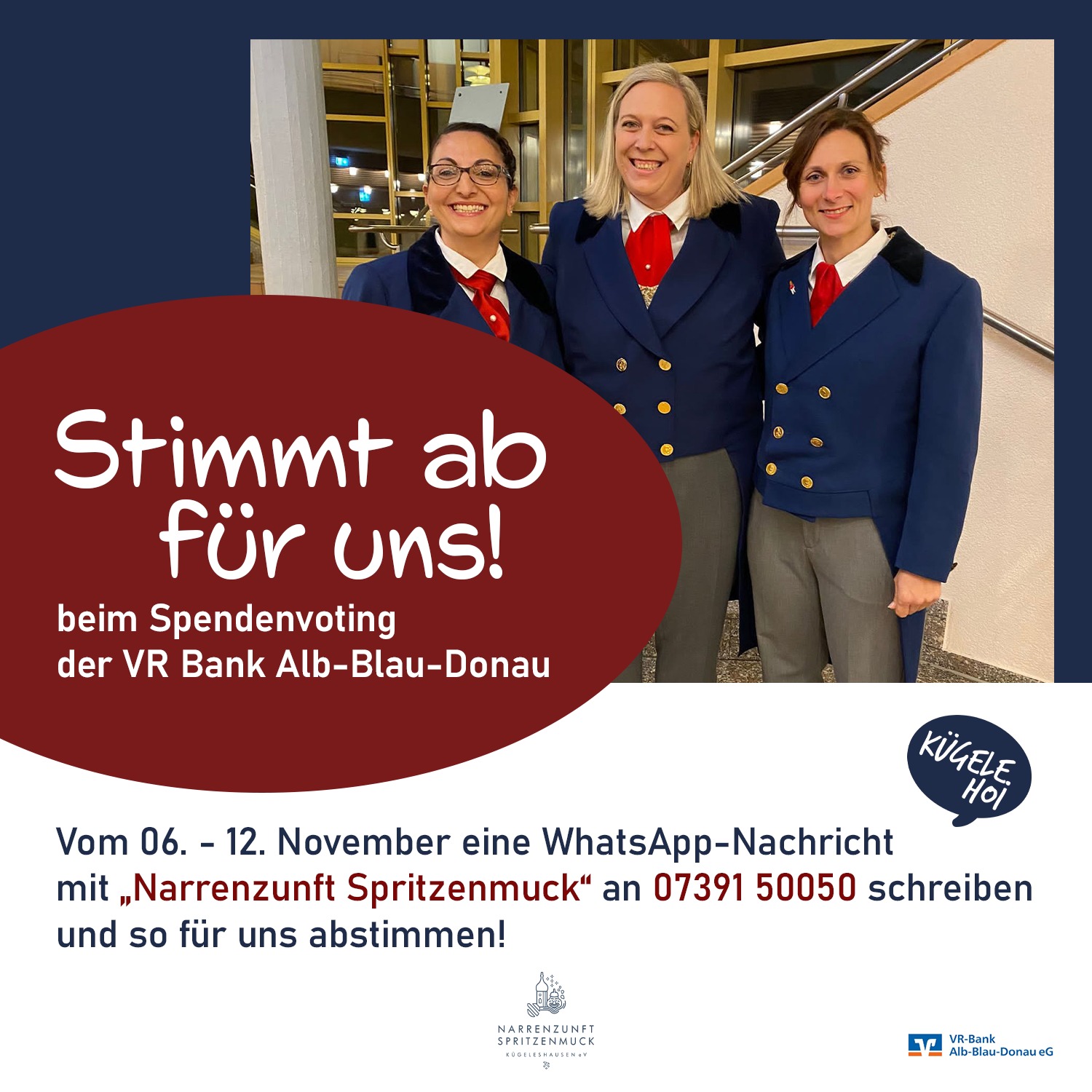 Die Narrenzunft Spritzenmuck beteiligt sich am Spendenvoting der VR-Bank Alb-Blau-Donau. Stimme bis 12.11. für die Narrenzunft ab. Sende dazu eine WhatsApp-Nachricht mit "Narrenzunft Spritzenmuck" an 07391 50050.