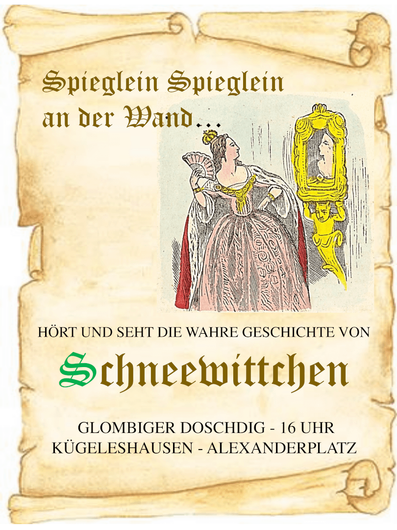 Das diesjährige Spektakel erzählt die wahre Geschichte des Ehinger Krettenweibes, das dieses Jahr 100 Jahre alt wird. Was hat ein Zauberspiegel damit zu tun? Warum Spieglein, Spieglein? Schneewittchen, hä? Machen vielleicht sogar Zwerge mit? Nicht fragen! Anschauen! Glombiger 16:00 Uhr auf dem Marktplatz von Kügeleshausen!